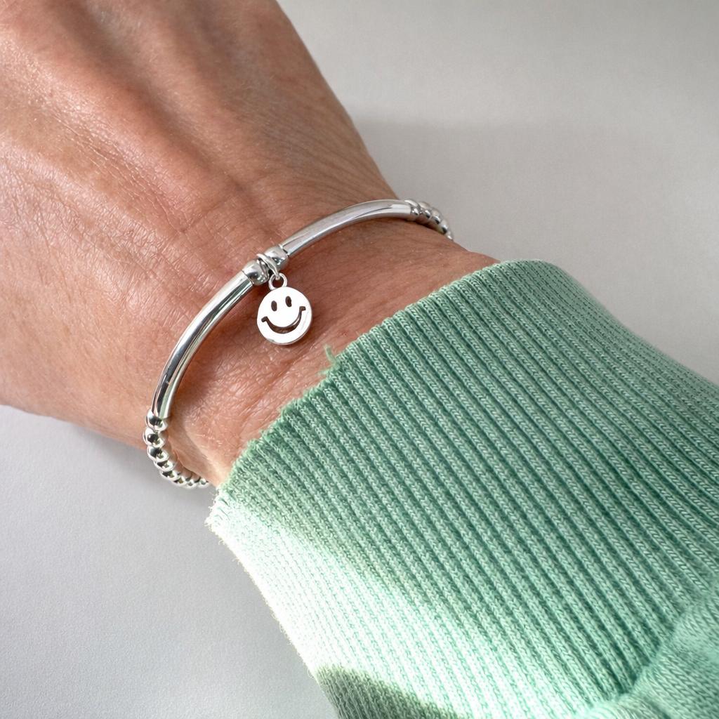 This super cute sterling silver stretch beaded smiley face charm bracelet features stretch making it easy to slip on and off, ideal for stacking, for easy everyday wear and makes a perfect keepsake gift.