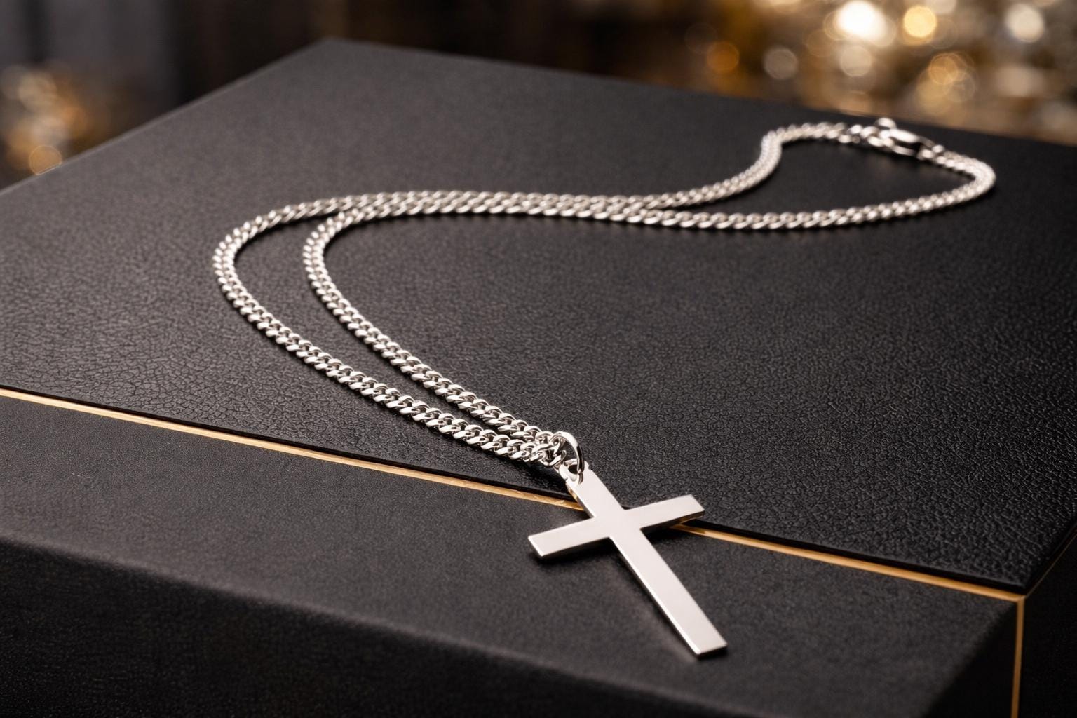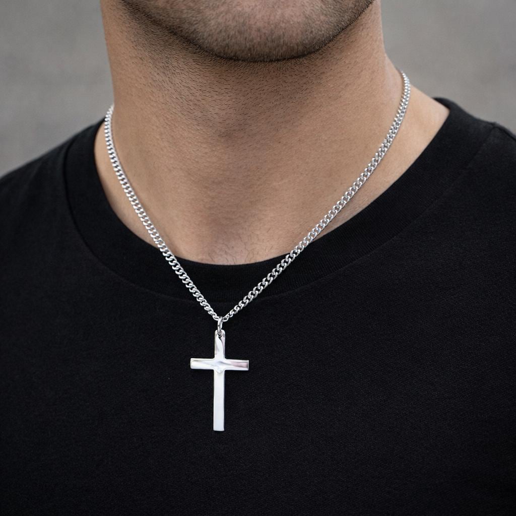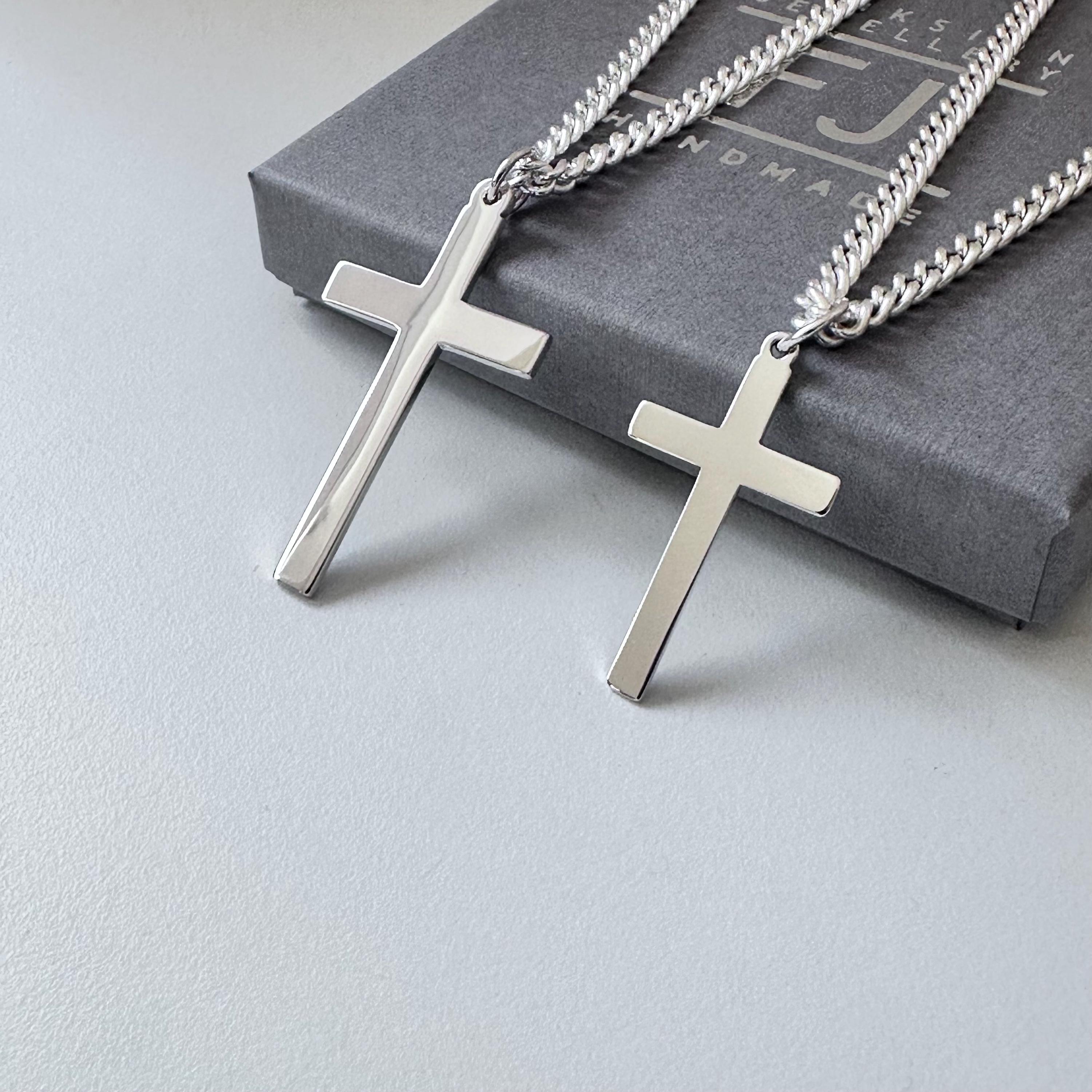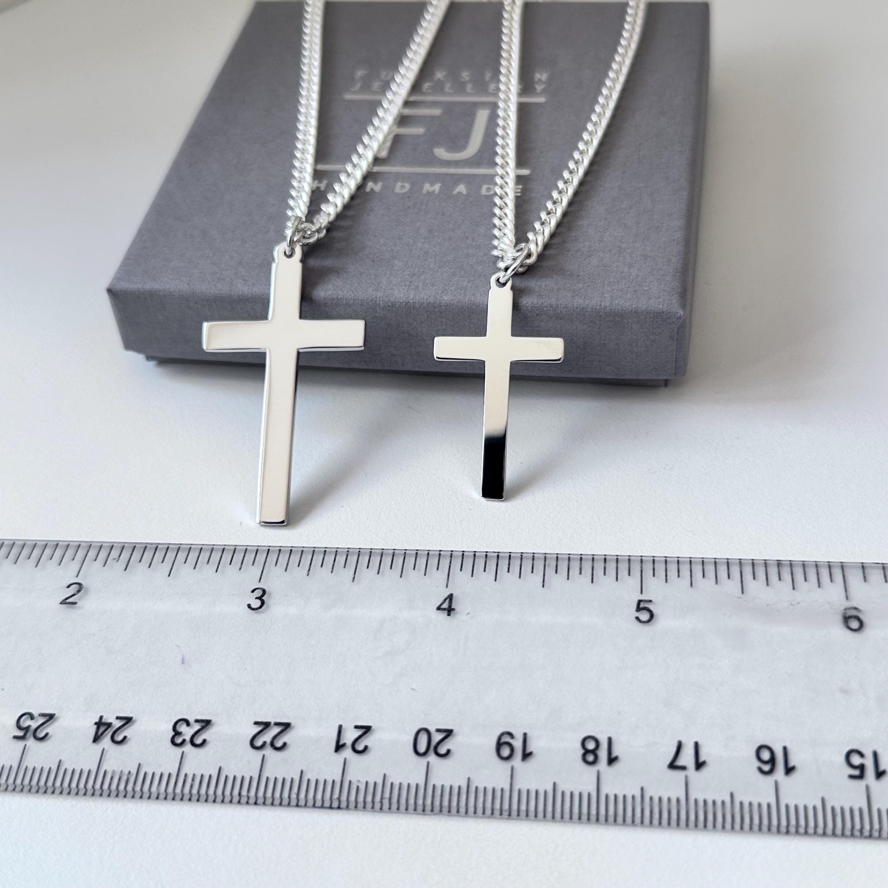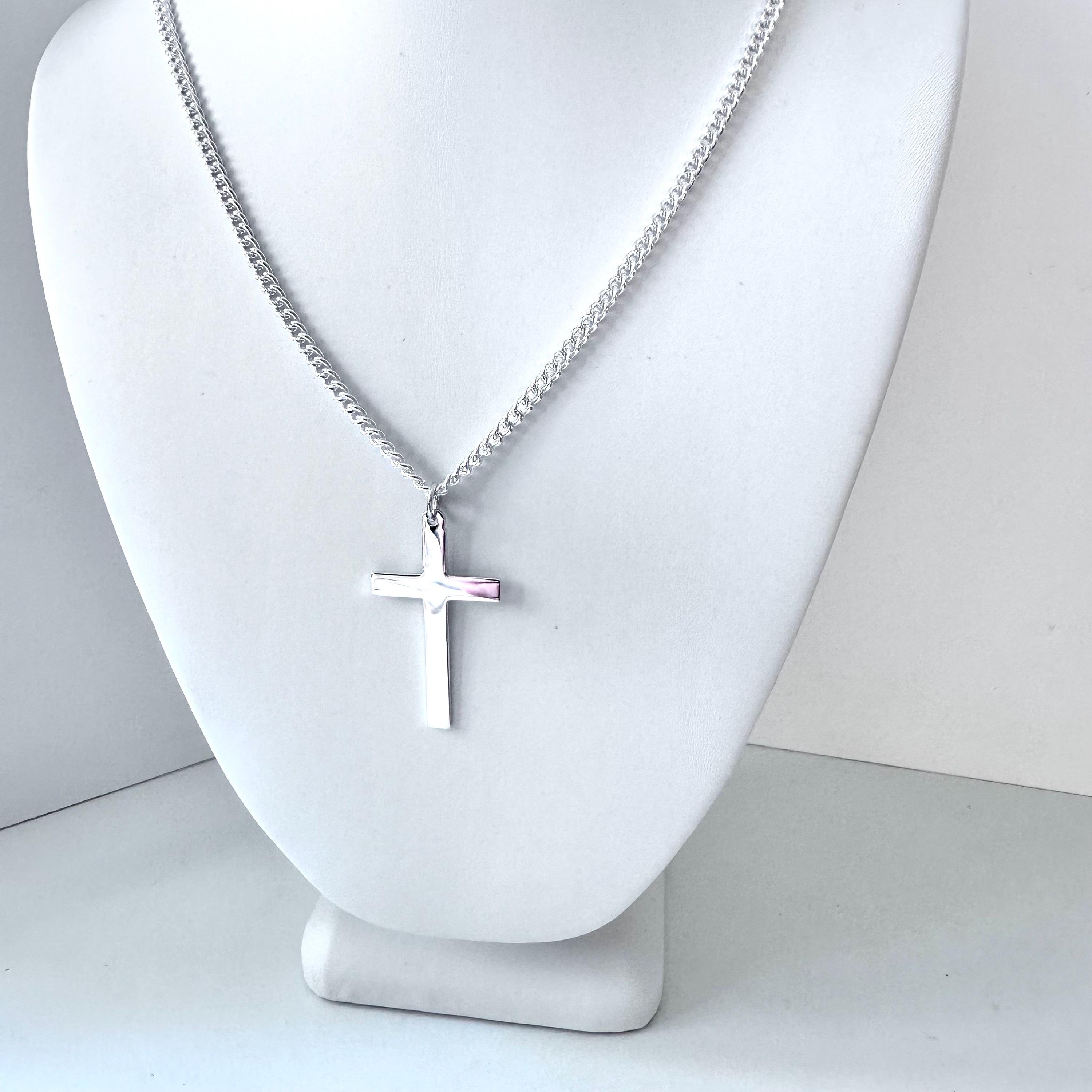 This stylish mens / womens silver cross necklace features a classic cross pendant - choose from either a large 43mm or medium 32mm - on a 3.5mm curb chain necklace available in the size / length of your choice and as an optional extra can be personalised with a sterling silver initial charm at the clasp (see link to initial charms below)