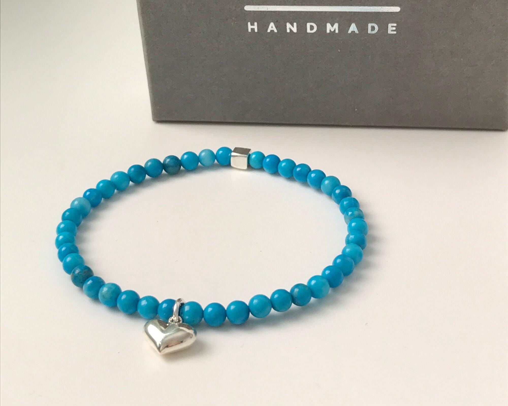 These energy giving calming & stress relief intention bracelets feature 4mm dyed turquoise howlite gemstone beads, a pretty sterling silver puffed heart charm and stretch, making them easy to slip on and off, ideal for stacking & for easy everyday wear.